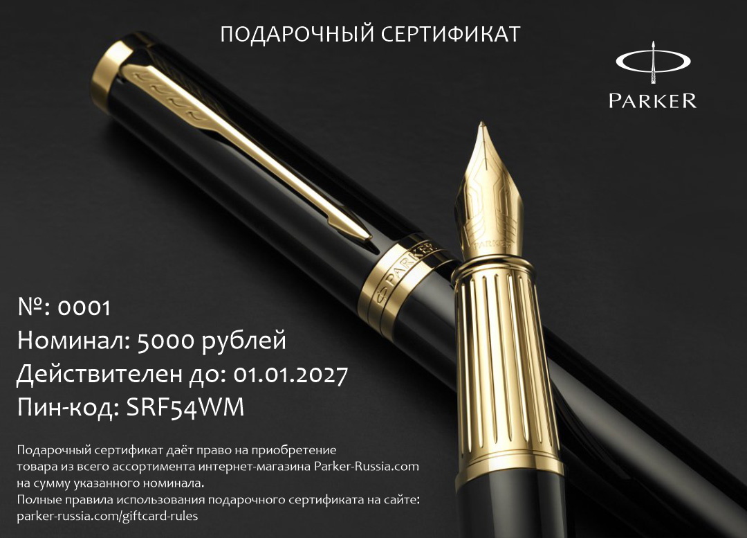 Подарочный сертификат Parker 5000 от официального дилера Parker в Уссурийске. Вы можете дополнительно заказать гравировку, которая подчеркнет Вашу оригинальность и придаст памятность статусному подарку. Все ручки Паркер поставляются в фирменном футляре.